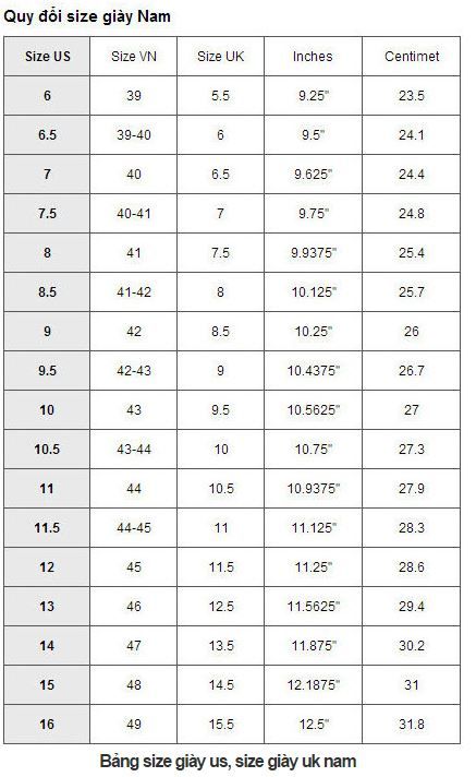 Từ chiều dài và chiều rộng mà bạn có, hãy chọn size phù hợp nhất dựa vào bảng quy đổi size giày nhé.