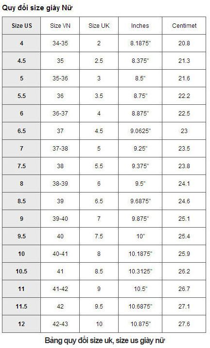 Giữa nam và nữ luôn có những quy chuẩn về size giày khác nhau và đối với mỗi quốc gia cũng có những quy định khác biệt về size giày một cách sâu sắc. Khi mua giày mang tính quốc tế bạn nên biết bảng quy đổi chuyển đổi size giày giữa các nước để việc lựa chọn được chuẩn xác hơn.