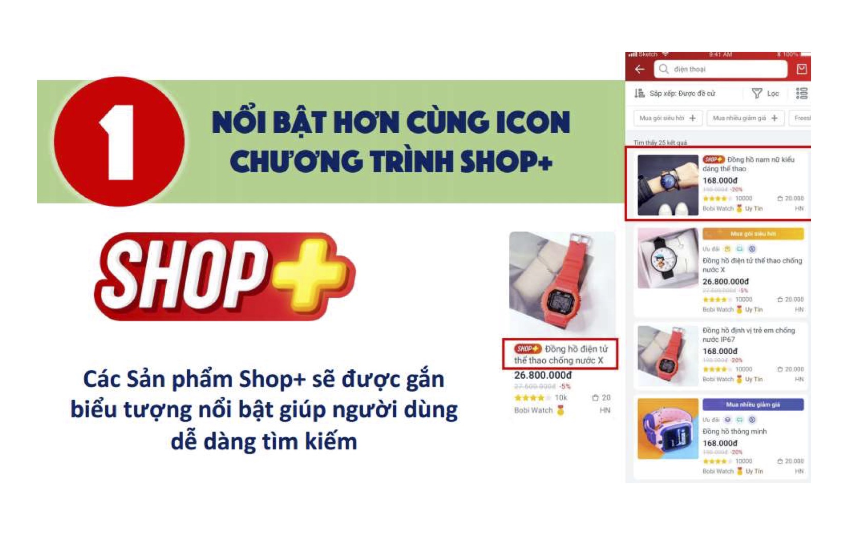 Các sản phẩm Shop+ sẽ được gắn biểu tượng nổi bật, giúp người dùng dễ dàng tìm kiếm. Ngoài ra cũng tăng độ uy tín cho sản phẩm của mình vì chứng minh được shop đã được duyệt.