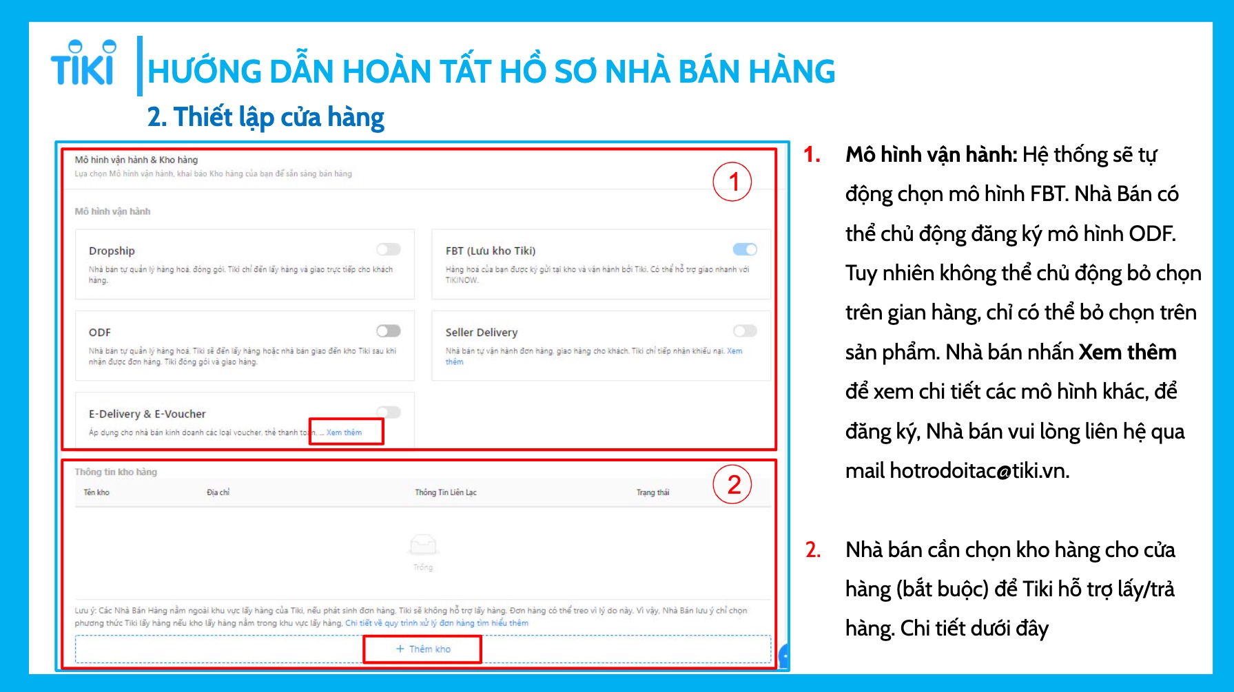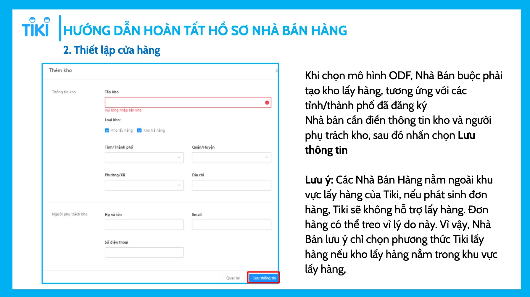 Khi chọn mô hình ODF, Nhà Bán buộc phải tạo kho lấy hàng, tương ứng với các tỉnh/thành phố đã đăng ký. Nhà bán cần điền thông tin kho và người phụ trách kho, sau đó chọn Lưu thông tin.