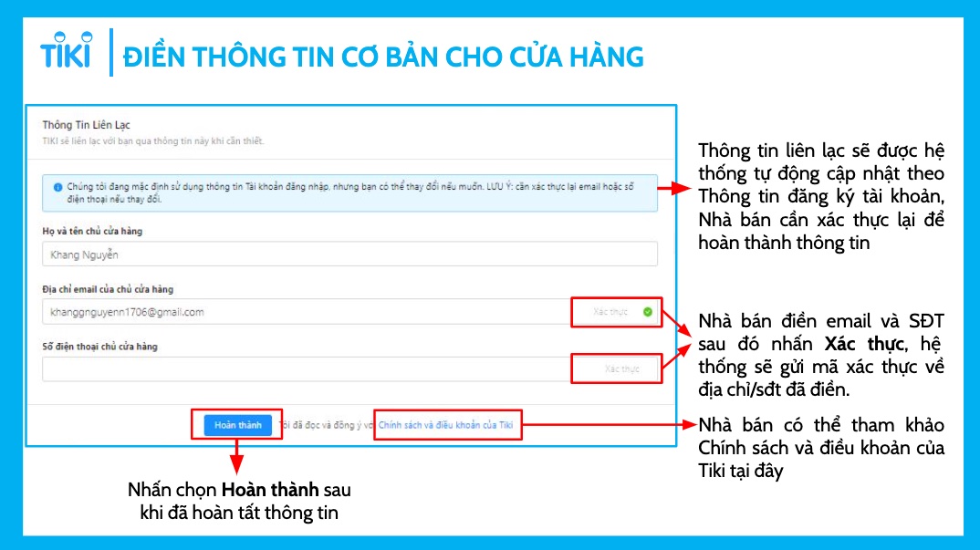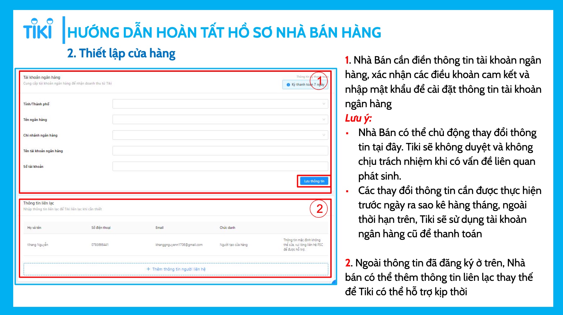 Ngoài thông tin cơ bản, Shop có thể thêm thông tin liên lạc thay thế để Tiki có thể hỗ trợ kịp thời.