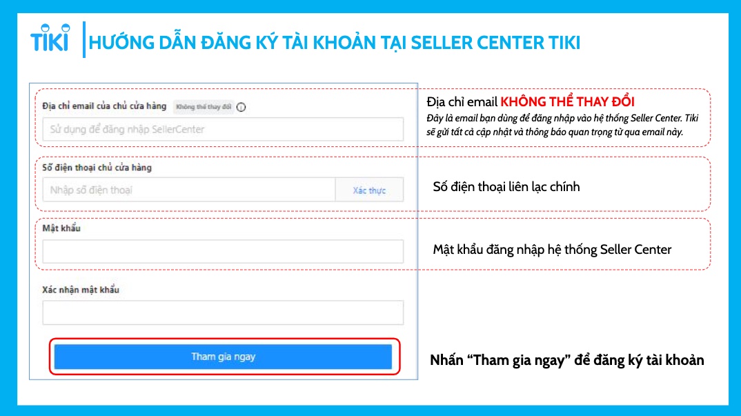 Để đăng ký bán hàng thành công trên Tiki, nhà bán cần điền đầy đủ thông tin cơ bản trong link trên: