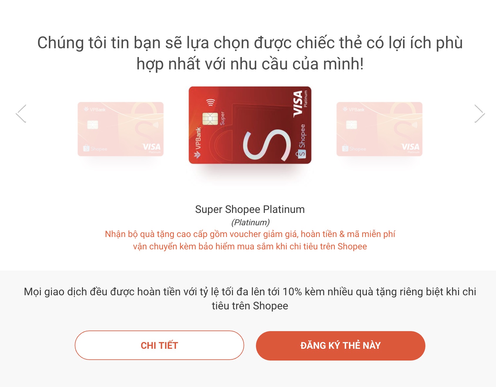 Bạn sẽ được đưa đến trang lựa chọn giữa hai thẻ: Super Shopee Platinum hoặc Shopee Platinum. Ở trên mình đã so sánh lợi ích giữa 2 loại thẻ, vì vậy chắc chắn bạn cũng đã có lựa chọn cho riêng mình rồi. Ở đây thì mình có thu nhập tốt, trên 100 triệu/năm. Vì vậy mình chọn thẻ Super Shopee Platinum để nhận được ưu đãi 10% khi mua sắm Shopee cùng với việc miễn phí thường niên năm đầu và năm tiếp theo nếu chi tiêu trên 100 triệu ở 12 tháng đầu tiên.