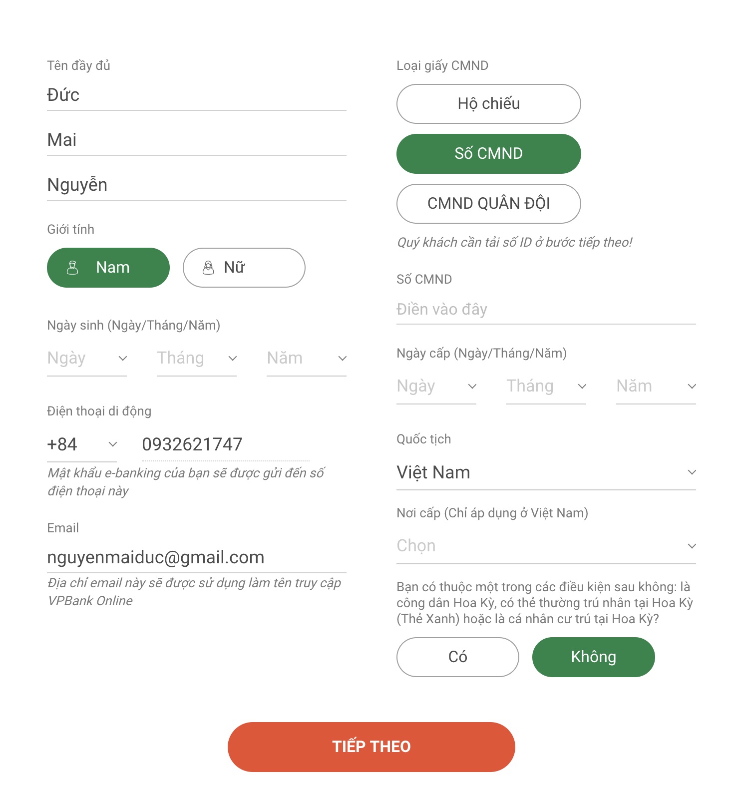Tiếp theo bạn sẽ cần điền đầy đủ thông tin cá nhân bao gồm giới tính, ngày sinh, chứng minh nhân dân, ngày cấp, quốc tịch và nơi cấp. Ngân hàng VPBank luôn cam kết sẽ bảo mật thông tin cá nhân của bạn. Sau khi điền đầy đủ thông tin thì bạn sẽ bấm chọn nút TIẾP THEO.