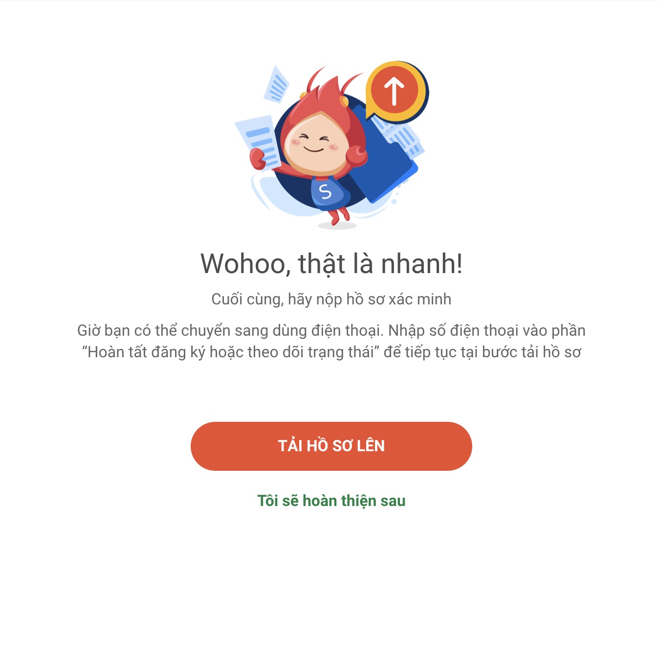 Vậy là bạn đã đăng ký thành công. Hiện tại VPBank đã cho phép bạn có thể tự tải hồ sơ lên mà không cần phải mang ra đến tận chi nhánh làm việc ngân hàng. Hãy bấm vào nút GỬI HỒ SƠ để làm tiếp nhé.