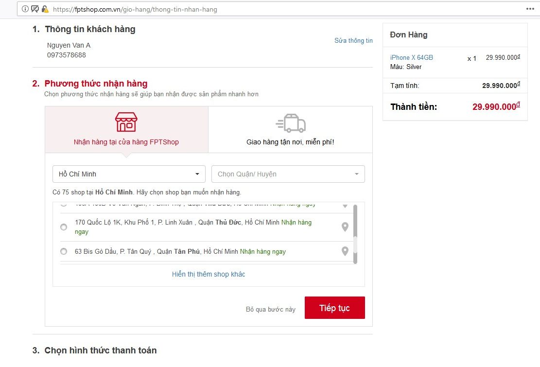 Đối với phương thức nhận hàng tại cửa hàng FPT Shop. Bạn hãy chọn tỉnh, thành phố đang ở, sau đó chọn địa chỉ Shop gần nhất và chọn Tiếp Tục.