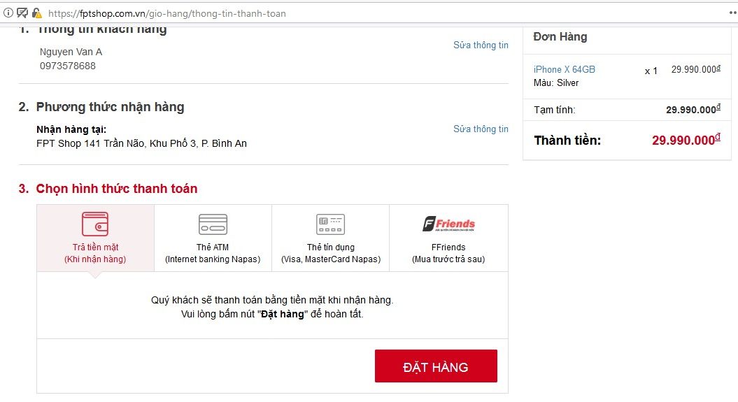 Bạn có thể lựa chọn hình thức thanh toán bằng tiền mặt khi nhận hàng. Hoặc thanh toán qua thẻ ATM và thẻ tín dụng hoặc theo chương trình bạn đồng hành FFriends. Nếu bạn chọn hình thức thanh toán tiền mặt khi nhận hàng. Vui lòng bấm nút Đặt hàng để hoàn tất.