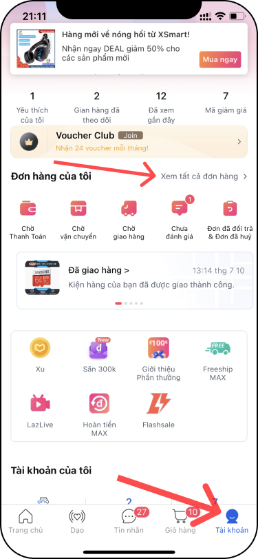 Bạn vào mục Tài khoản > Xem tất cả đơn hàng như hình bên dưới.