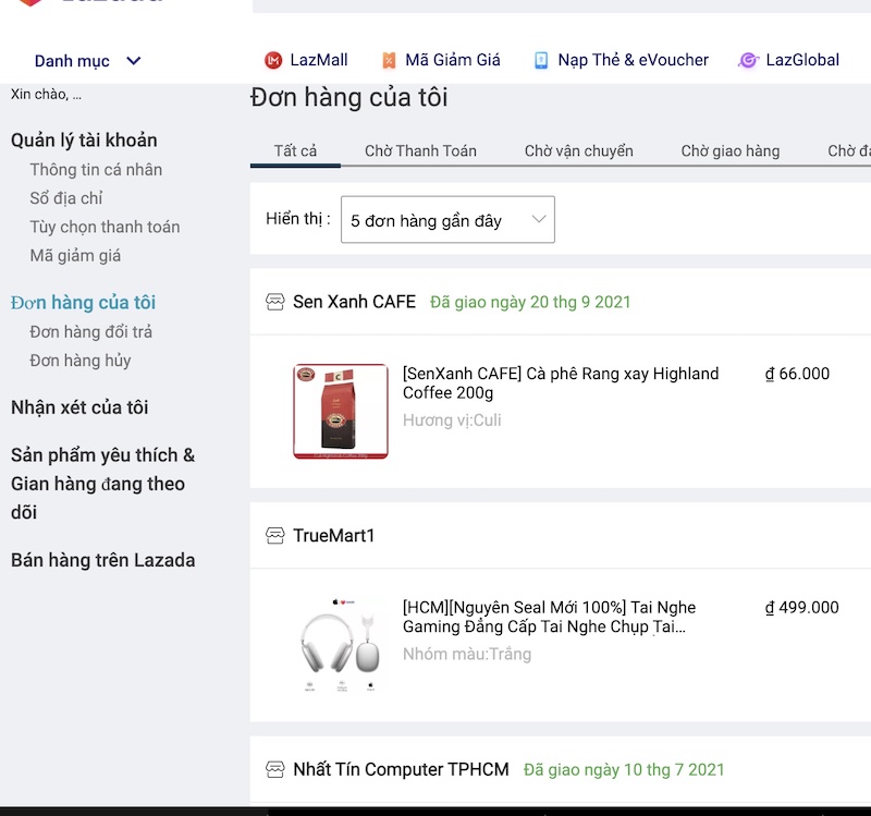 Bước 1: Đăng nhập và vào mục đơn hàng Lazada