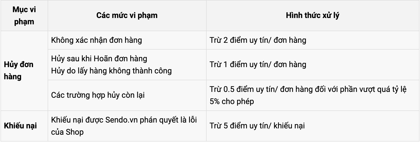 • Các trường hợp hủy còn lại: Trừ 0.5 điểm uy tín/đơn với phận vượt quá 5% cho phép.