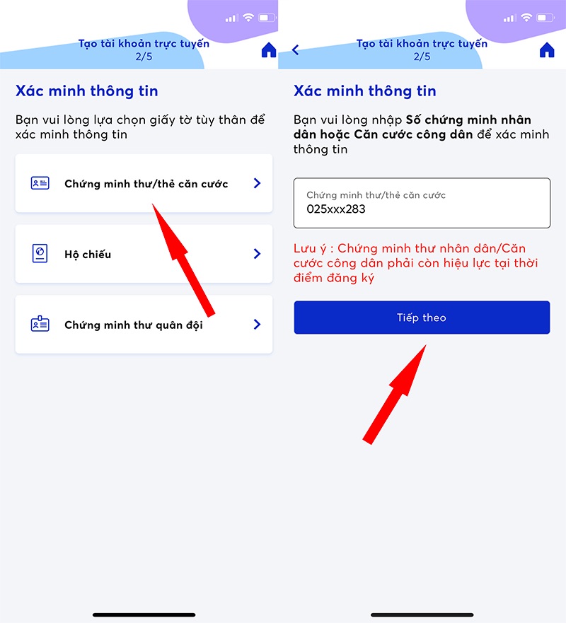 Bước tiếp theo, cung cấp thông tin cá nhân của bạn thông qua giấy tờ tuỳ thân như Chứng minh thư / Thẻ căn cước công dân/ Hộ chiếu / Chứng minh thư quân đội.