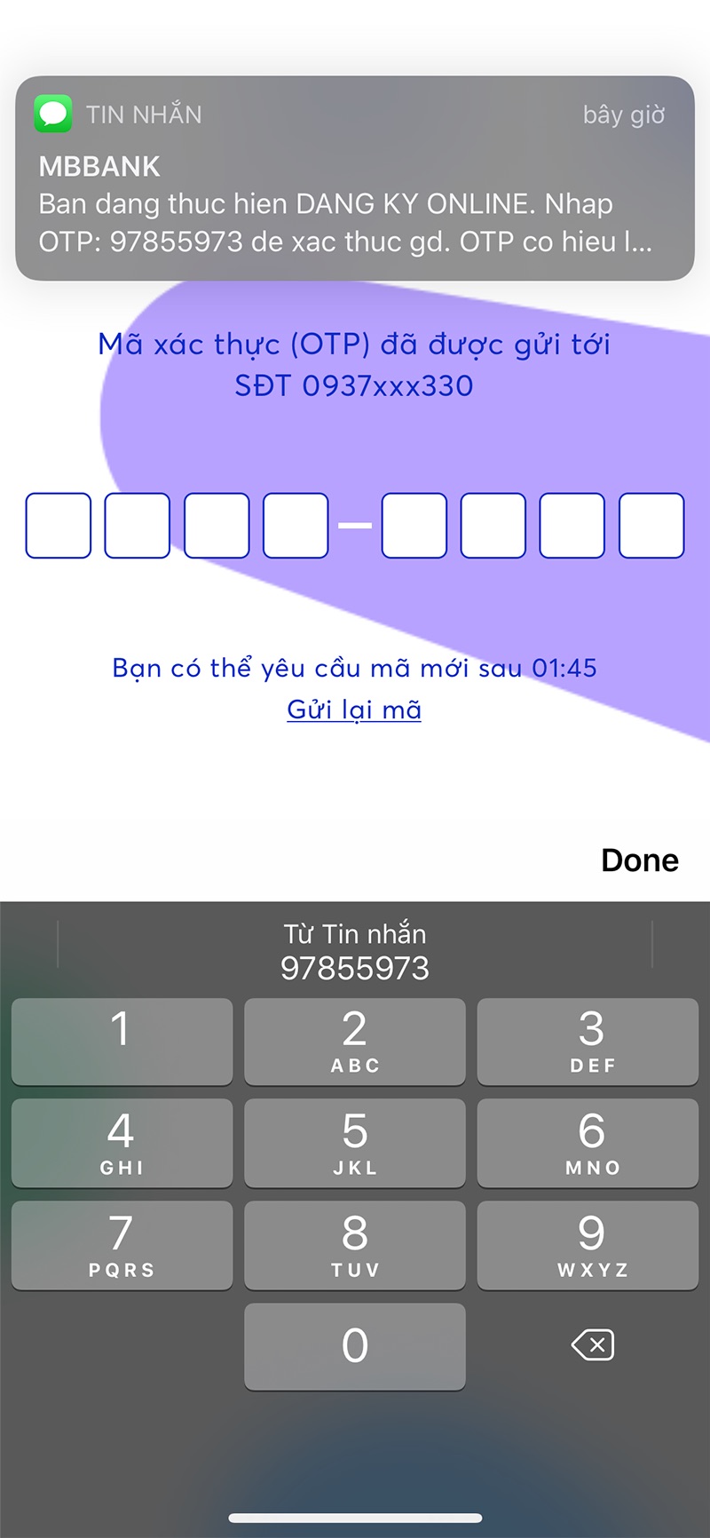 Hệ thống sẽ gửi mã OTP về số điện thoại cho bạn. Bạn nhập chính xác mã số này và nhấn xác nhận để hoàn tất việc kích hoạt ứng dụng vay tiền online của MBBank.